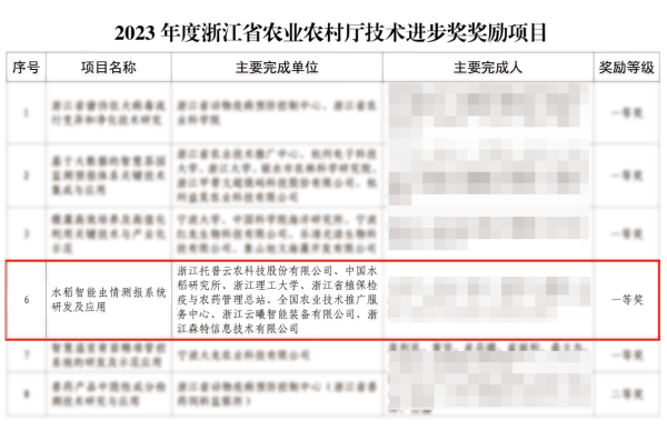 近日,加快建設(shè)創(chuàng)新浙江因地制宜發(fā)展新質(zhì)生產(chǎn)力動(dòng)員部署會(huì)暨全省科學(xué)技術(shù)獎(jiǎng)勵(lì)大會(huì)在杭州舉行。大會(huì)公布并表彰了2023年度浙江省科學(xué)技術(shù)獎(jiǎng)。其中,由浙江托普云農(nóng)科技股份有限公司(股票簡(jiǎn)稱(chēng):托普云農(nóng),股票代碼:301556)牽頭完成的《水稻智能蟲(chóng)情測(cè)報(bào)系統(tǒng)研發(fā)及應(yīng)用》成果榮獲2023年度浙江省科學(xué)技術(shù)進(jìn)步獎(jiǎng)三等獎(jiǎng)。這是該項(xiàng)成果繼榮獲“2023年度浙江省農(nóng)業(yè)農(nóng)村廳技術(shù)進(jìn)步獎(jiǎng)一等獎(jiǎng)”之后斬獲的第二個(gè)重磅獎(jiǎng)項(xiàng),充分展現(xiàn)了托普云農(nóng)在農(nóng)業(yè)科技創(chuàng)新領(lǐng)域的卓越實(shí)力。